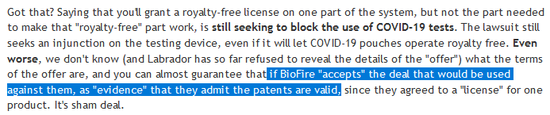 而且这个举动背后的意思也很暧昧:如果 BioFire 真的跑去堡垒投资要许可了,相当于变相承认了使用了堡垒投资的专利;等以后上了法庭,这就是实打实的罪证。