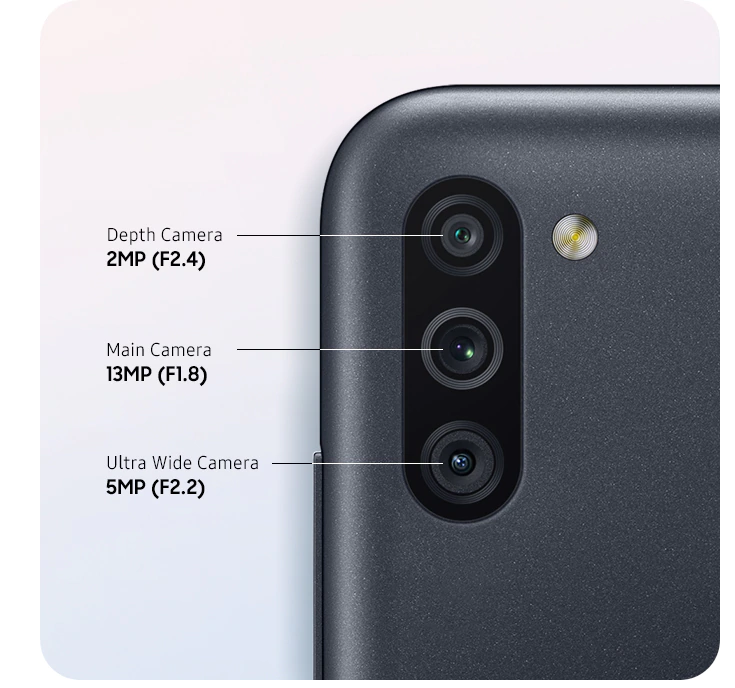 后置三摄为 13MP @ f/1.8 主摄 + 5MP @ f/2.2 超广角 + 2MP @ f/2.4 深度传感器的组合,另有一枚后置指纹传感器。配色方面,消费者将有黑、紫、天蓝色可选