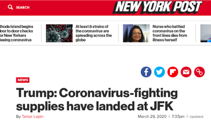 《纽约邮报》介绍说,这一援助计划被称为联邦应急管理局(FEMA)项目“空中桥梁计划”——首架载有200万个口罩和医用罩衣、1000多万副手套和7万支温度计的飞机,周日在肯尼迪国际机场降落。