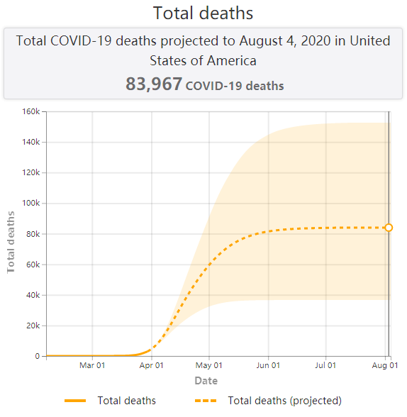 当前该网站预测美国将于 4 月中旬经历新冠病毒死亡人数的高峰,15 号那天或有 2271 人被病魔带走。此外截至 8 月初,新冠病毒或造成超过 8.2 万的死亡病例。