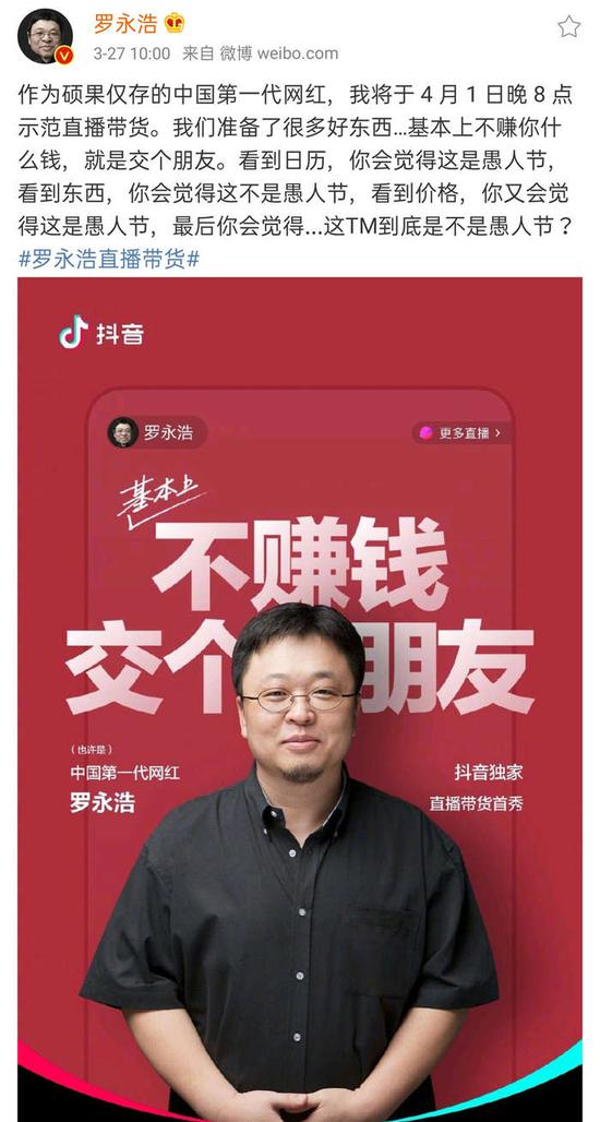 关于老罗说的“招商证券的调研报告”,我们找到一段话,就是关于红人效应带动成为热门话题,而在4月1日晚上直播之前的预热海报与微博当中,我们可以看到,老罗也自称是“硕果仅存的中国第一代网红”。显然,老罗也是利用了红人效应进行精准营销。