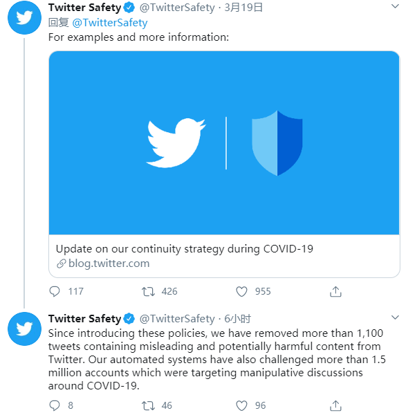 据外媒CNET报道,自3月18日以来,Twitter已删除了1100多条误导性和潜在有害的推文。此前该公司推出了新指南,禁止发布可能增加新型冠状病毒传播的内容。Twitter还表示,其自动系统已经挑战了利用垃圾邮件或操纵行为的150多万个帐户,这些账户针对围绕COVID-19(由病毒引起的呼吸道疾病)的讨论。这些新数据发布之际,该社交媒体公司因没有采取足够的措施打击冠状病毒骗局而面临批评。
