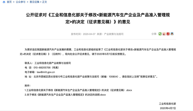 4月7日下午消息,工业和信息化部组织起草了《工业和信息化部关于修改<新能源汽车生产企业及产品准入管理规定>的决定(征求意见稿)》,向社会公开征求意见。工信部表示,随着国内外形势的发展变化,为更好适应我国新能源汽车产业发展需要,进一步放宽准入门槛,激发市场活力,加强事中事后监管,促进我国新能源汽车产业高质量发展,需要对《准入规定》部分条款进行修改。