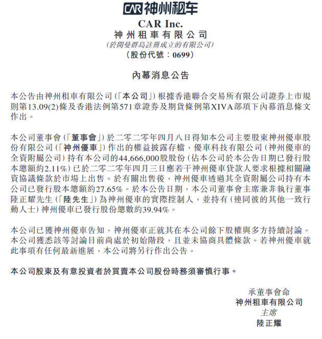 公告称,于本公告日期,本公司董事会主席兼非执行董事陆正耀先生陆先生为神州优车的实际控制人,并持有(连同彼的其他一致行动人士)神州优车已发行股份总数约39.94%。本公司已获神州优车告知,神州优车正就其在本公司余下股权与多方持续讨论。