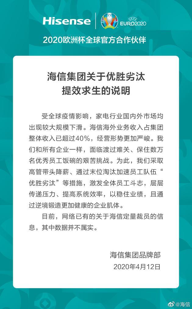 4月12日上午消息,海信集团就公司优胜劣汰、提效求生发布说明指出:受全球疫情影响,家电行业国内外市场均出现较大规模下滑。海信海外业务收入占集团整体收入已超过40%,经营形势更加严峻。我们和所有企业一样,面临渡过难关、保住数万名优秀员工饭碗的艰苦挑战。