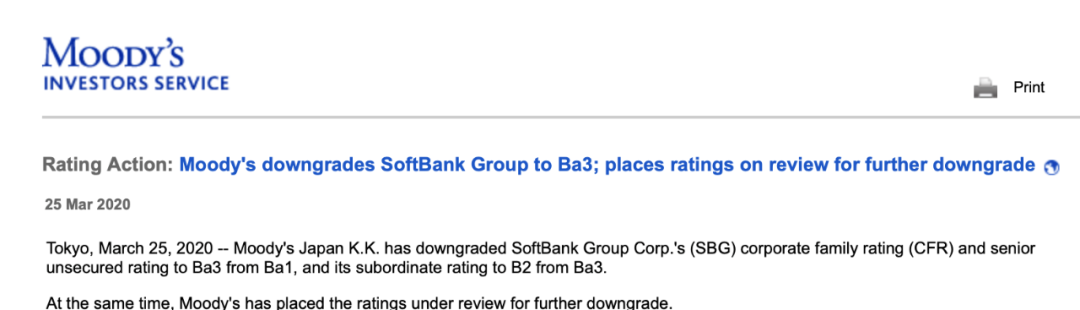 3月25日,穆迪将软银的信用评级从投机级类别(垃圾级的)最高级Ba1下调两档,降至Ba3。这意味着软银的信用评级在垃圾级类别中越陷越深。3月初,另一家评级巨头标普将软银的展望调整为负面。评级巨头出于对软银巨额负债的担心,调低了评级。