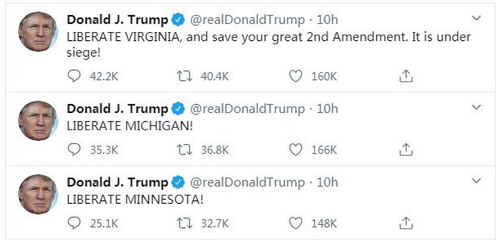 4月17日,特朗普在推特上发布了一系列极具煽动性的推文,呼吁美国公民利用宪法第二修正案赋予的持枪权去“解放”因疫情而实施社会隔离政策的各州。当天就注册了数十个以“reopen+州”的域名,如reopenmn.com和 reopeningchurch.com等等。外媒KrebsOnSecurity通过调查,发现其中大多数是保守派团体和枪支权益拥护者发起的。