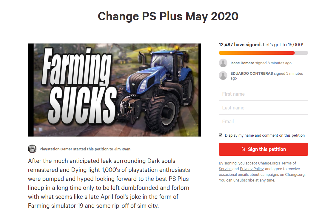 在四月末索尼Playstation官方公布了各服的五月PS+会免阵容,港服和欧美服一致为《城市:天际线》以及《模拟农场19》两款“种田”游戏。这样的阵容引起了大批玩家的不满,甚至有激动的PS玩家跑去change.org发起联名请愿要求索尼更换游戏,截至发稿请愿已经有12500人参与。