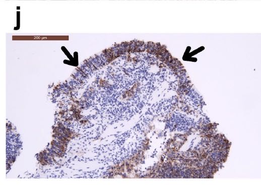 在接种病毒后2天和5天检测到病毒抗原的区域,可以观察到单核细胞浸润。SARS-CoV-2的N蛋白的免疫组织化学表明,在接种病毒后2天,金仓鼠的支气管上皮细胞中存在病毒抗原(下图的箭头所指位置)。