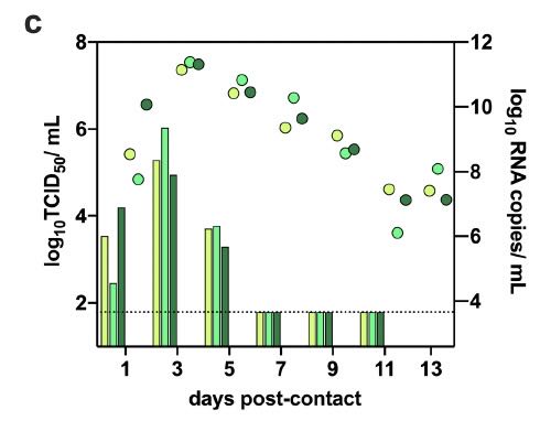 使用PRNT分析,从接种病毒后14天的供体上(所有滴度为1:640)和共居仓鼠接触后13天(以1:160、1:320和1:160滴度)检测中和抗体。研究者连续14天从供体仓鼠的鼻洗液中检测到病毒RNA,但传染性病毒滴度迅速下降。研究者重复了该实验,并以接种病毒后6天供体仓鼠与幼稚仓鼠共居。在接触后3天,共居幼稚仓鼠鼻洗液中能够检测到少量病毒RNA,在接触后7天的鼻洗液中检测到不到病毒RNA。而且,在鼻洗液中未检测到传染性病毒,如下图所示: