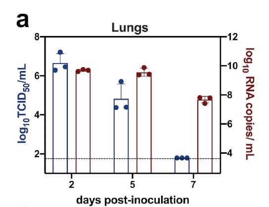 实验中,研究者给金仓鼠鼻内感染了8 x 10的负4次方TCID50(50%组织细胞感染量)的新冠病毒(Beta-CoV / Hong Kong / VM20001061 / 2020病毒,GISAID#EPI_ISL_412028)。该病毒是从香港一位新冠肺炎患者的鼻咽抽吸物和咽拭子的Vero E6细胞中分离出来的。研究者分别在金仓鼠接种病毒后的2天、5天、7 天时收集了鼻甲、脑、肺、心脏、十二指肠、肝脏、脾脏和肾脏组织,以监测病毒复制和组织病理学变化。在接种病毒后第2天时,能检测到金仓鼠肺部病毒载量峰值,在接种病毒后5天时病毒载量开始降低。尽管能继续检测到高拷贝的病毒RNA,但在接种病毒后7天未检测到具有传染性的病毒。
