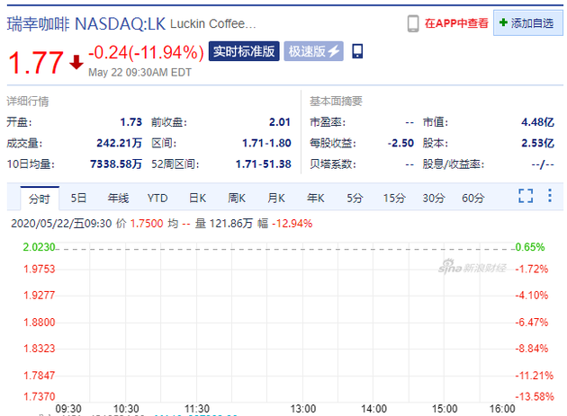 5月22日晚间消息,瑞幸咖啡开盘再跌13.9%,昨日收跌28.72%。瑞幸咖啡周三在纳斯达克复牌,当日收盘瑞幸咖啡股价报2.82美元,跌幅达35.76%。瑞幸咖啡此前公告称,已在5月15日收到纳斯达克交易所的退市通知。