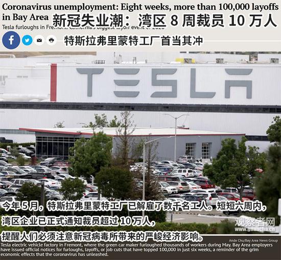 当然,特斯拉工厂的员工可能也没有更多选择。当地媒体《水星新闻》18日报道,加州湾区8周已裁员10万人,特斯拉弗里蒙特工厂首当其冲。