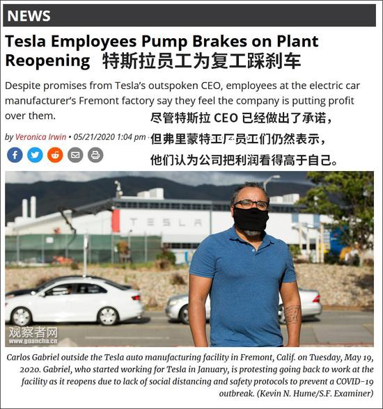 加布里尔16日组织了一场小规模的工人抗议,他说,尽管当地很多人都非常欣赏马斯克开办工厂解决就业问题的行为,但马斯克本人从未表现出对当地社区的认同,他几个月来一直威胁把这座容纳1万名蓝领工人就业的工厂从湾区搬走,而不考虑是否会对当地经济带来灾难性后果。