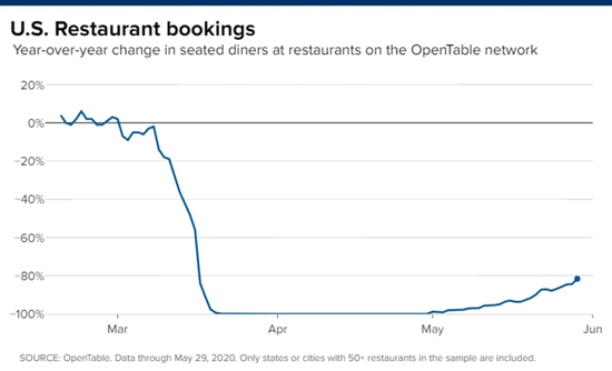由于大多数州限制餐饮业的各类业务,餐饮业受到了新冠病毒的严重打击。 OpenTable网络公司的数据显示,随着这些规定的实施,餐厅的预订量直线下降,3月最后几周和4月的大部分时间里,餐厅预订量与去年同期相比下降了100%。