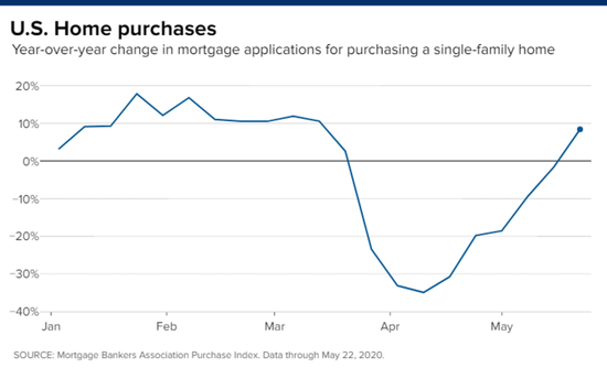 美国抵押贷款银行家协会(mortgage Bankers Association)的数据显示,虽然4月份单户住房抵押贷款购买指数较去年下降了30%以上,但此后该指数又出现了逆转。与去年同期相比,该指数上涨了近10%,这表明购房市场可能正在迅速复苏。