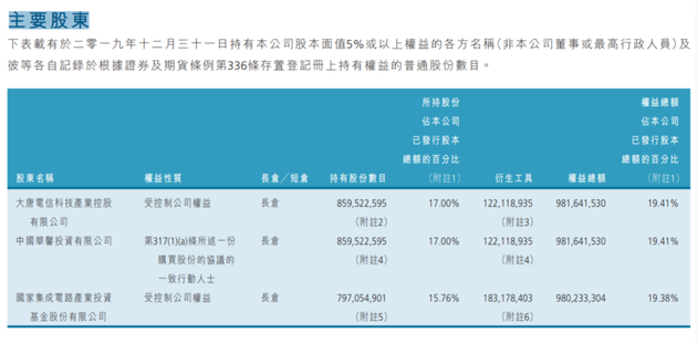 至2019年年末,中芯国际有两个大股东,其中大唐通过大唐控股(香港)投资有限公司持股比例17%,且中国华馨投资有限公司与大唐为一致行动人;国家集成电路基金通过全资附属公司鑫芯(香港)投资有限公司持股约15.77%。
