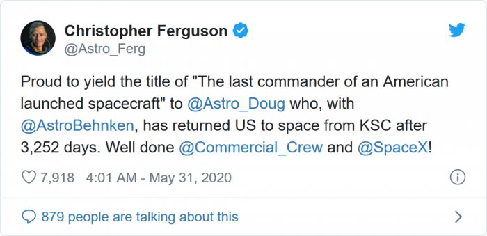 NASA的一些宇航员也在Twitter上分享了一些对两位乘坐龙飞船前往ISS的宇航员的祝福: