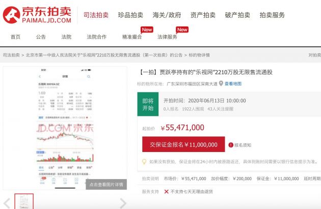 据北京市第一中级人民法院发布的拍卖公告,贾跃亭所持有的部分被冻结乐视网股权6月13日将被拍卖,起拍价55471000元,底价2.51元/股,比6月5日收盘价1.52元/股还要高65%。