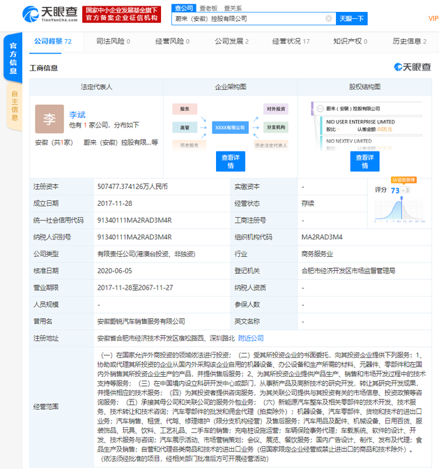 蔚来(安徽)控股有限公司成立于2017年11月,经营范围包括在国家允许外商投资的领域依法进行投资;在中国境内设立科研开发中心或部门,从事新产品及高新技术的研究开发,转让其研究开发成果,并提供相应的技术服务;新能源汽车整车及相关零部件的技术开发、技术服务、技术转让和技术咨询等。天眼查股东信息显示,该公司工商披露的股东中,包括了NIO USER ENTERPRISE LIMITED、NIO NEXTEV LIMITED、NIO Power Express Limited。