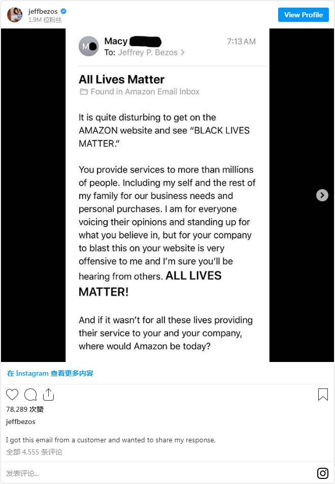 贝佐斯上周五在Instagram上发布了一封不同的客户邮件,在邮件中,一个名叫Macy的人因为BLM的横幅而反对公司,称 "ALL LIVES MATTER!"。贝佐斯发布邮件回应称,BLM指出美国黑人“在我们的司法和执法系统中遭遇的种族歧视和更高的风险”。