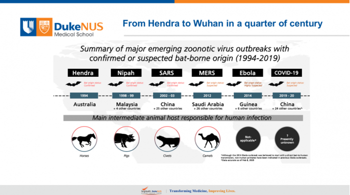 王林发:非常感谢金教授,感谢未来论坛给我这个机会,实际上我在新发传染病,尤其是蝙蝠来源的新发传染病领域整整工作了25年,正好是四分之一的世纪。今年新冠病毒发生的时候我在武汉,我和石正丽老师有长期的合作,尽管我这次没有到中国工作,但是回到新加坡以后,18日回到新加坡,23日我们第一个病例,所以我在新加坡新冠病毒的应对方面,主要的作用是在病毒学和血清学方面,所以今天稍微讲一点这方面的工作。主要是回顾一下这25年来,我们在了解病毒产生的新发传染病里面到底学到了什么样的经验。