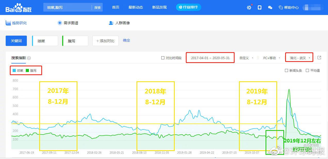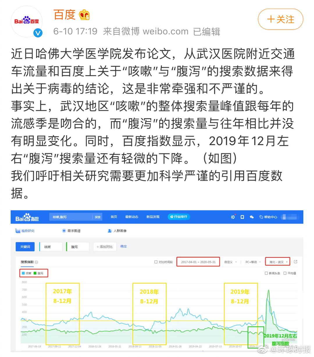 @百度 昨日在微博上发文称:近日哈佛大学医学院发布论文,从武汉医院附近交通车流量和百度上关于“咳嗽”与“腹泻”的搜索数据来得出关于病毒的结论,这是非常牵强和不严谨的。事实上,武汉地区“咳嗽”的整体搜索量峰值跟每年的流感季是吻合的,而“腹泻”的搜索量与往年相比并没有明显变化。