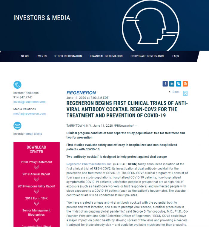 自5月以来,我们看到一些参与单克隆抗体药物研发的公司宣布进行临床试验,Regeneron制药公司是最新一家推进人体试验的公司。该公司将进行四项独立的试验,旨在研究单克隆疗法治疗COVID-19病例和预防感染的有效性和安全性。