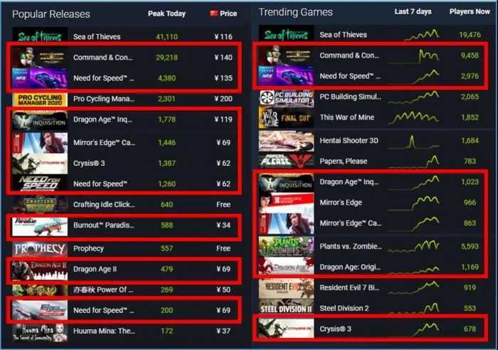 但最后并不等于最差,如果玩家仔细观察Steam上的游戏排行榜,同样会发现一件有意思的事情——作为游戏食物链最后一环的Steam,其上架的经典游戏销量反而是最好的。比如前段时间与EA开展合作后,Steam平台重新上架多款EA旗下经典大作,而EA也上演了对Steam趋势榜和当日畅销榜的“屠榜”操作,这背后的直接原因是Steam玩家的强烈购买欲。