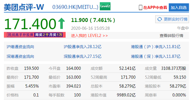 6月16日下午消息,美团点评一度大涨至7.65%,创下171.70港元的上市最高价,市值突破万亿港元大关。截至发稿,美团点评涨7.46%报171.4港元,市值达9989亿港元。
