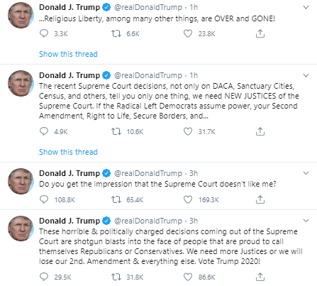这一裁决结果出炉之后,特朗普在推特上连发数推,抨击最高法院。