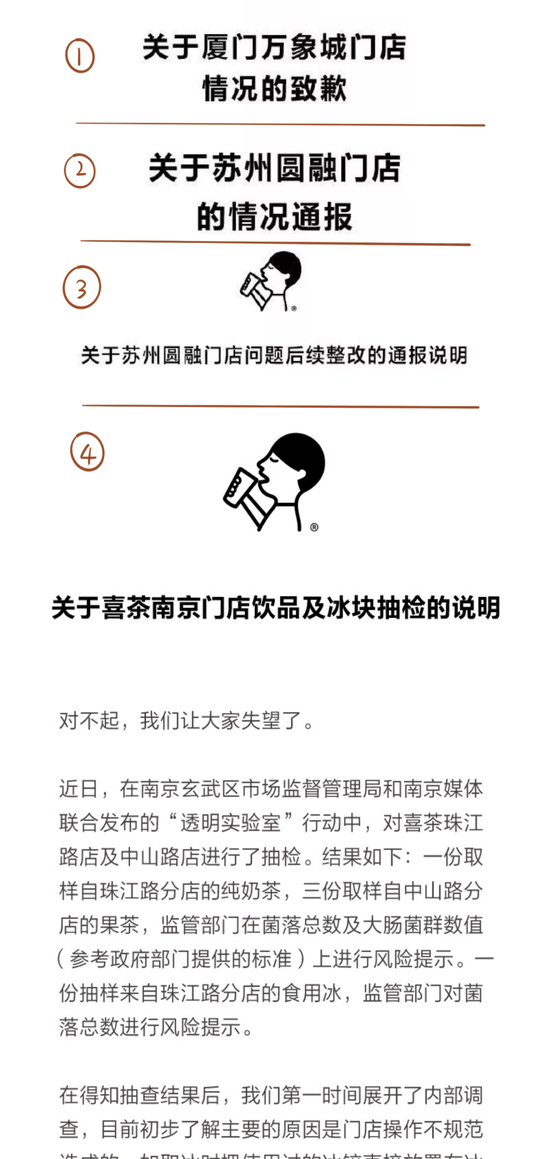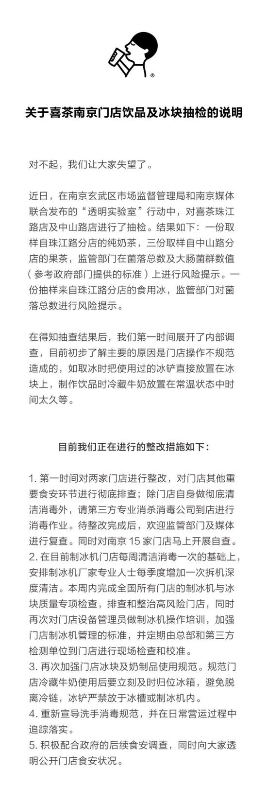 喜茶官方已于6月17日披露南京所有门店已经完成整改和第三方SGS冰水质检,同时提及其它地区门店的冰水检测也在加急进行。