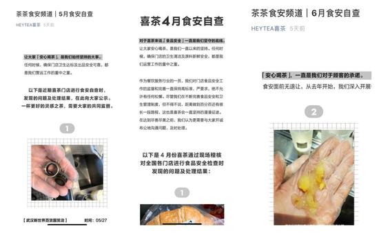 喜茶官方公众号显示,从4月份开始新增了一个“食安自查”板块,即每月披露出自查的卫生问题和对相应门店的处理办法。