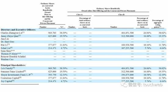 IPO前,陆正耀持股30.53%;钱治亚持股19.68%;Mayer Investments Fund, L.P.持股12.4%;大钲资本持股为11.9%,愉悦资本持股为6.75%。