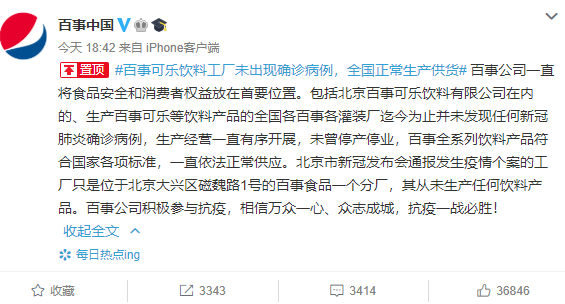 声明称,包括北京百事可乐饮料有限公司在内的、生产百事可乐等饮料产品的全国各百事各灌装厂,迄今为止并未发现任何新冠肺炎确诊病例,生产经营一直有序开展,未曾停产停业,百事全系列饮料产品符合国家各项标准,一直依法正常供应。