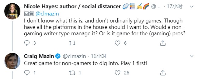 此外,Craig Mazin还回答了作家Nicole Hayes的问题,Nicole Hayes问道,虽然家中有各种游戏平台但是她没有玩过初代,那么没有游戏经验的人是否可以上手,还是《最后的生还者2》只适合核心玩家?