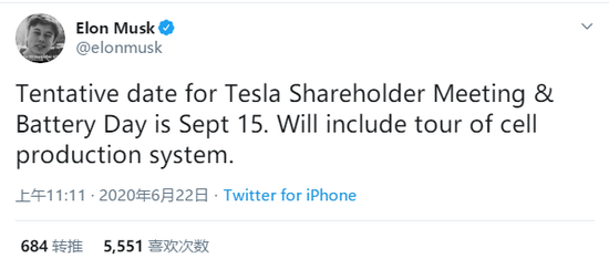 北京时间6月22日上午消息,特斯拉CEO马斯克在社交媒体上发文称,暂定于9月15日召开特斯拉年度股东大会和电池日活动。活动将包含参观电池生产系统。上周,马斯克曾发布推文称,受新冠肺炎疫情影响,特斯拉不得不推迟原定于7月7日举行的年度股东大会。当时他预测可能在一个月后。