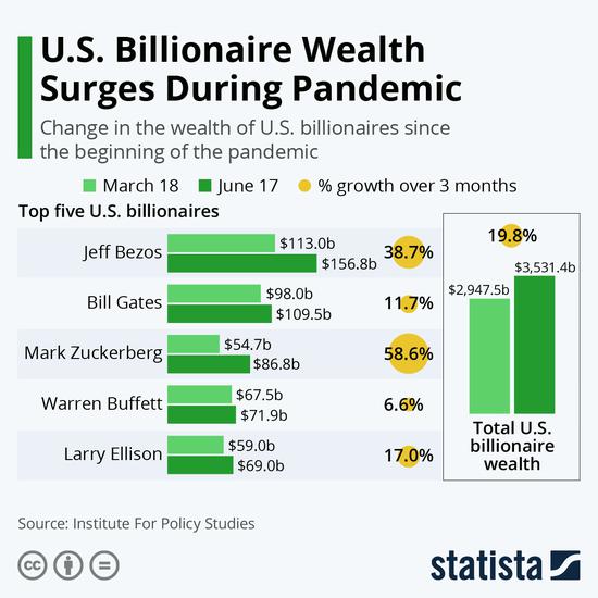 据政策研究所(Institute for Policy Studies)和美国税收公平协会(Americans for Tax Fairness)的分析,自新冠疫情开始以来,美国亿万富翁的财富增长了近20%。数据显示,在3月18日至6月17日之间,美国643位亿万富翁的总资产从2.9万亿美元增至3.5万亿美元,另有29个人加入了“万亿美元俱乐部”。