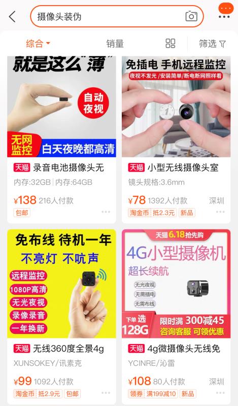 澎湃新闻搜索发现,宣称“隐蔽、不易被发现”的微型摄像头在多个电商平台均有售卖,体积最小的仅有一个指甲盖大小。