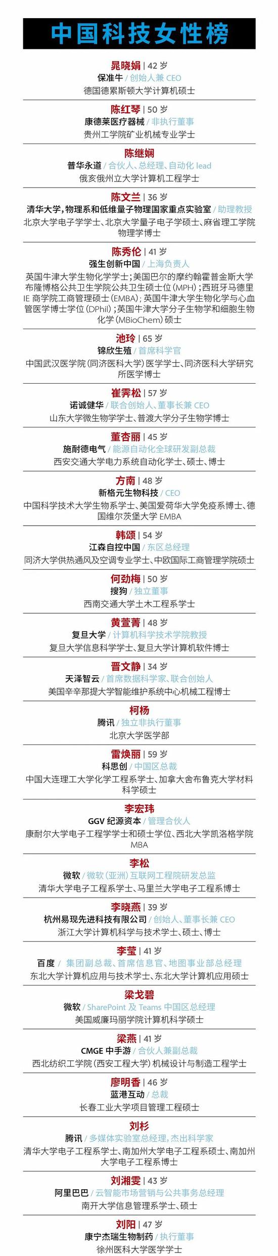 “中国科技女性榜” 致力于发掘科技领域的女性力量,是对科技领域的顶尖50名女性的无等级评估。她们可能是企业创始人、公司高管、一线研发工程师或者是技术创新先锋。只有积极参与以技术为中心的企业或科技领域的女性才会被纳入榜单范畴,且榜单候选人必须具备科学、技术、工程或数学专业教育背景。