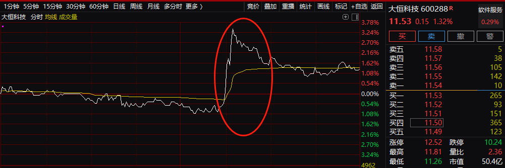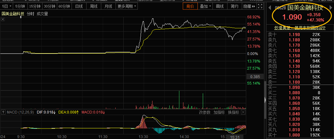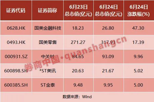 A股中关村、ST金泰和*ST美讯全线涨停,香港市场国美零售收盘暴涨17.39%,最多时涨幅超过24%;国美金融科技收盘狂飙47.3%,盘中最大涨幅一度超过58%。五大股票单日市值增长近65亿元人民币。