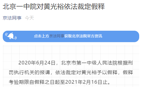 6月24日,北京市第一中级人民法院根据刑罚执行机关的报请,依法裁定对黄光裕予以假释,假释考验期限自假释之日起至2021年2月16日止。假释,是对被判处有期徒刑、无期徒刑的犯罪分子,在执行一定刑期之后,因其遵守监规,接受教育和改造,患有严重疾病或确有悔改表现,不致再危害社会,而附条件地将其予以提前释放的制度。公开信息显示,2008年11月,黄光裕被拘。2010年,黄光裕因犯非法经营罪、内幕交易罪和单位行贿罪被法院判处有期徒刑14年,并处罚金6亿元,没收个人财产两亿元。