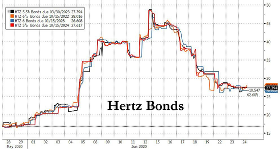 当然,那些在三周前把该股股价推高至6美元的散户们并不在乎这些。赫兹租车股价在今天一度上涨超过90%,而该公司的债券价格依然不到账面价值的30%。