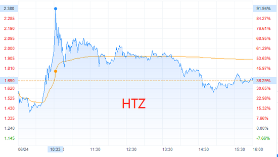 赫兹租车在今天又走出了诡异走势,跳空高开36%,早盘一度涨超92%,随后跳水走低,截至收盘,该股震荡下行收涨36%,报1.69美元。原因是,华尔街中型投行杰富瑞(Jefferies)的分析师Hamzah Mazari和Bret Jordan发布报告称,这家破产公司可以出售其大约15万辆汽车存货,并以某种方式实现30亿美元的收益(大约每辆二手车2万美元),如此一来,该公司可能会在申请破产后有望继续运营。