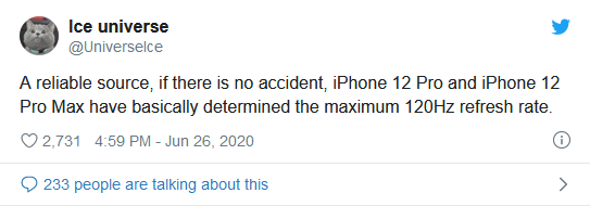 据爆料者称,苹果即将推出的“iPhone 12 Pro”和“iPhone 12 Pro Max”将具有高达 120Hz 刷新率的屏幕,从而提供更流畅的屏幕体验。Ice Universe 今天上午发推文说:“可靠的消息来源,如果没有发生意外,iPhone 12 Pro 和 iPhone 12 Pro Max 基本上已经确定了最大 120Hz 的刷新率。”