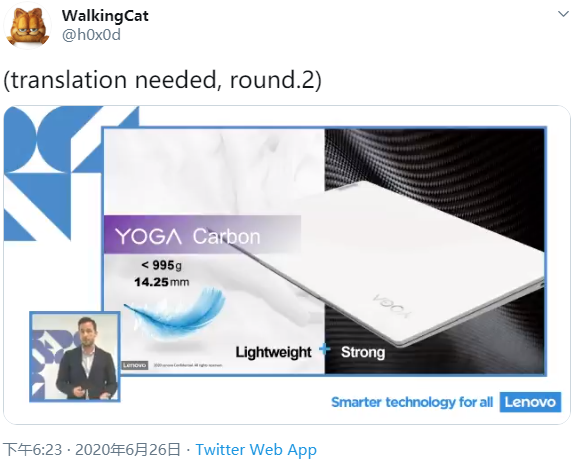 继昨日曝光了联想即将推出的双屏笔记本之后,今天我们又知晓了 Yoga Carbon 轻薄本的更多细节,比如厚度 14.25 mm、重 995 g 。得益于碳纤维盖板,Yoga Carbon 具有军事级的耐用性,同时电池续航可达 16 小时。