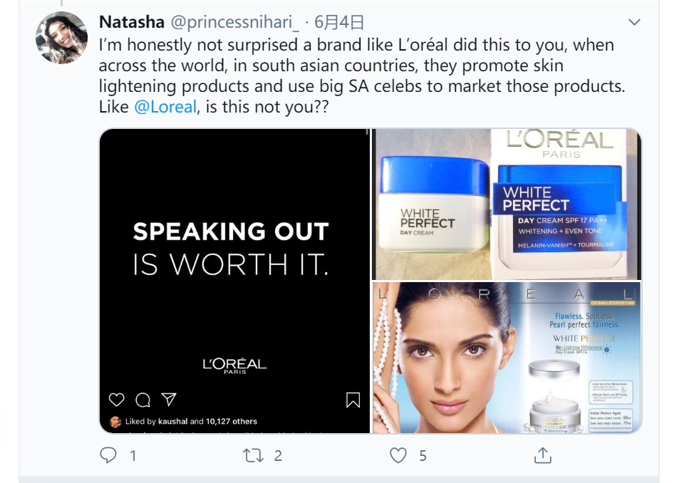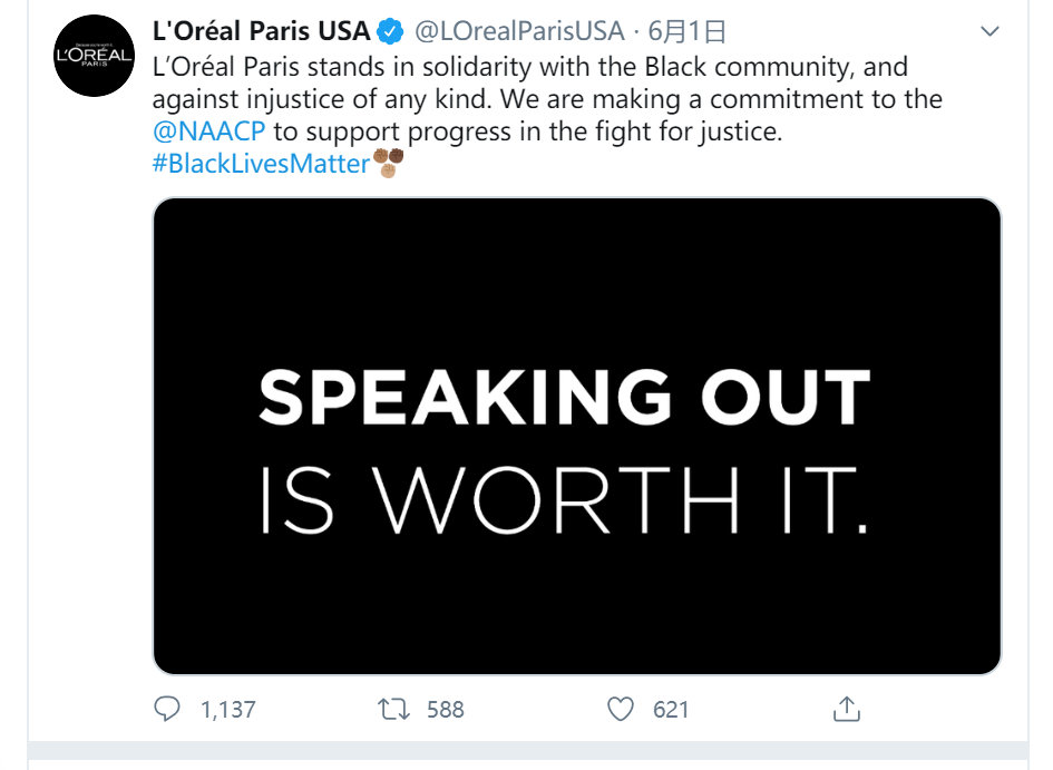 6月1日,欧莱雅美国地区的推特曾支持BLM称,“巴黎欧莱雅与黑人社区站在一起,反对任何形式的不公正。我们向@全国有色人种协进会(NAACP)作出承诺,支持为正义而战的进程。”