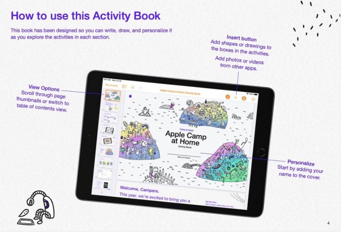 Apple Camp at Home项目将为8至12岁的孩子提供一系列的教学活动和课程,重点是艺术和设计、视频和编程。它在 Webex 上进行持续 30 至 60 分钟的实时虚拟会话。另外,苹果还提供了一种活动手册供孩子在家里完成。