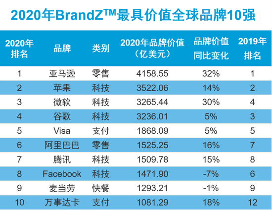 阿里巴巴的品牌价值增长了16%至1525亿美元,较去年排名上升一位至全球第6名,是中国最有价值的品牌。腾讯紧随其后,品牌价值增加15%至1510亿美元,也上升一位至第7名。