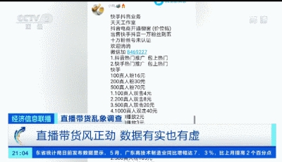数据显示:截至2020年3月,我国电商直播用户规模已达到2.65亿。仅今年第一季度,全国的电商直播就有400万次之多。那么,这一场场直播背后的数字,都能保证全部真实吗?在多个包含“直播涨粉”等字眼的聊天群里,记者看到,有不少声称可以在各大主流平台上提供刷观看、涨粉丝等服务的广告。每一项服务都明码标价,从几元到上百元不等。